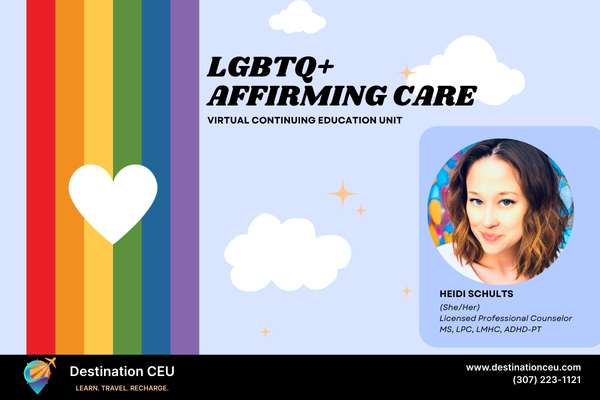This LGBTQ+ Affirming Care Training course, facilitated by Heidi Schults, MS, LPC, LMHC, ADHD-PT, offers comprehensive education aimed at fostering an inclusive and respectful environment for LGBTQ+ individuals. Participants will explore key concepts such as gender identity, gender expression, the significance of pronouns, societal constructs, and unconscious bias. Through reflective exercises and practical guidance, learners will enhance their awareness of internalized biases and privilege, develop strategies for effective allyship, and understand best practices for affirming care in professional settings.